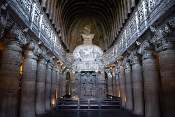 "A UNESCO World Heritage site hidden in a horseshoe-shaped ravine, the Ajanta Caves are a spectacular gallery of 30 rock-cut Buddhist monuments. Dating from the 2nd century BCE to 480 CE, they house world-renowned frescoes and sculptures that represent the peak of ancient Indian art."